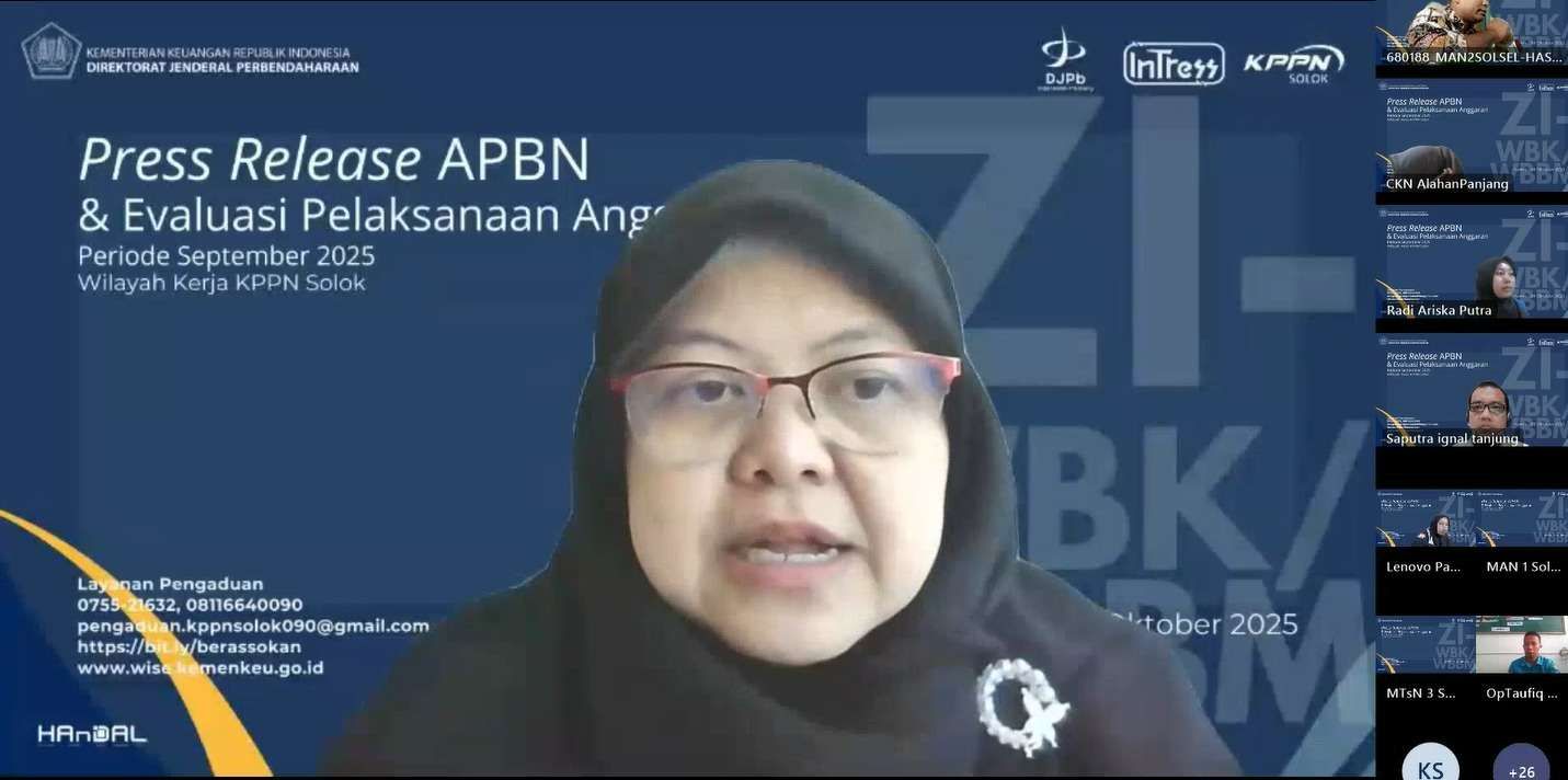 Solok – Kantor Pelayanan Perbendaharaan Negara (KPPN) Solok terus menunjukkan komitmen dalam menjaga transparansi dan akuntabilitas pengelolaan keuangan negara. Hal itu tercermin dari kegiatan Press Release Kinerja Pelaksanaan Anggaran Pendapatan dan Belanja Negara (APBN) yang digelar di Kantor KPPN Solok, Kamis (30/10/2025). Acara tersebut diikuti secara langsung dan daring oleh berbagai instansi pemerintah dari Kota Solok, Kabupaten Solok, dan Kabupaten Solok Selatan.